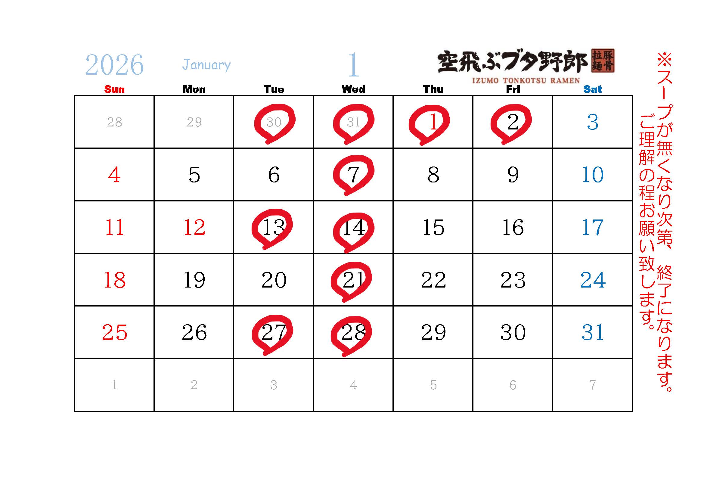 1月営業日のお知らせ Posted 2026年1月6日 by jbanocSLdzEo Tweet いつもご利用いただきありがとうございます。 2026年1月の当店の営業日を以下の通りお知らせいたします。 ※スープがなくなり次第、終了になります。ご理解のほどお願いいたします。