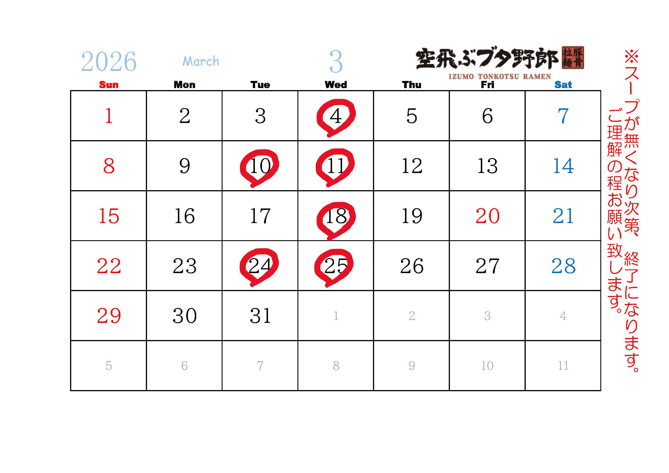 3月営業日のお知らせ Posted 2026年3月2日 by jbanocSLdzEo いつもご利用いただきありがとうございます。 2026年3月の当店の営業日を以下の通りお知らせいたします。 ※スープがなくなり次第、終了になります。ご理解のほどお願いいたします。